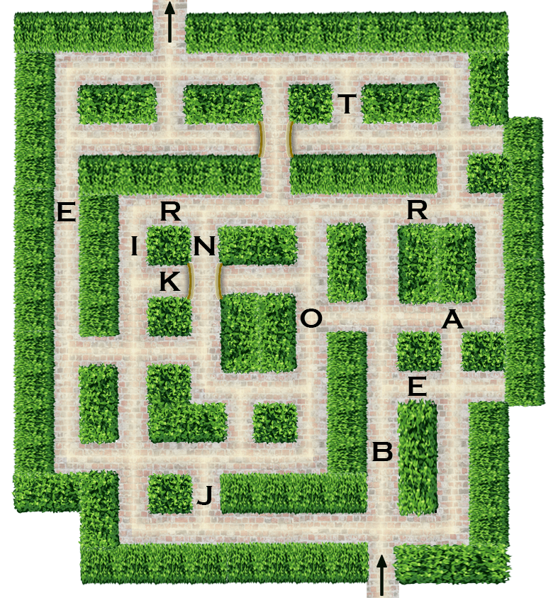 Zoek jouw route door het doolhof van de ingang onderaan tot aan de uitgang bovenaan. De twee bruggetjes mag je overheen of onderdoor. Onderweg passeer je letters. Die letters vormen jouw volgende bestemming, in de volgorde waarop je ze passeert. Maar, er zijn meerdere routes mogelijk naar de uitgang…