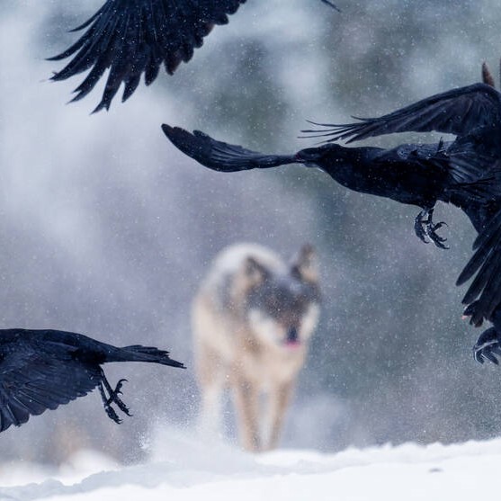 De wolf en de raaf werken goed samen in de jacht: de raaf kan een wolf naar een prooi leiden, en de wolf zorgt ervoor dat de raaf ook kan eten van de restjes.